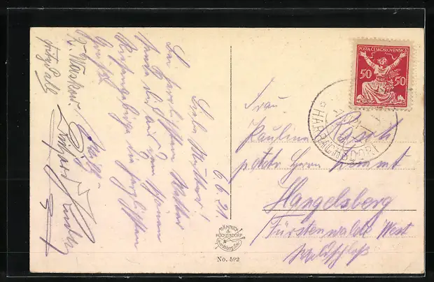 Personenbezogene Daten auf der Rückseite der Karte wurden durch blauen Textmarker unkenntlich gemacht. Die blauen Stellen sind auf die Vorderseite durchgeweicht und wirken sich negativ auf das Postkartenfoto aus