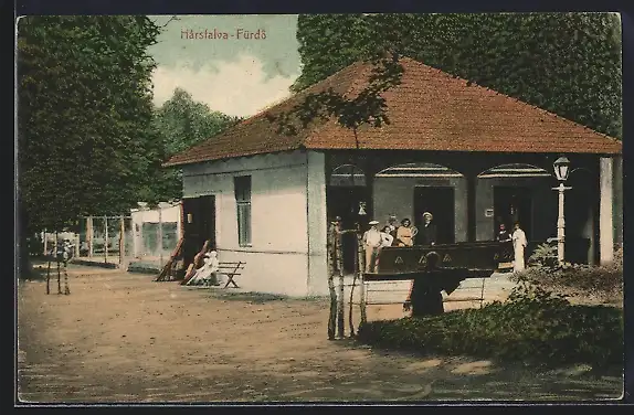 AK Hársfalva-Fürdö, Ortspartie mit Besuchern
