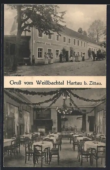 AK Hartau b. Zittau, Gasthof zum Weissbachtal, Innen- und Aussenansicht