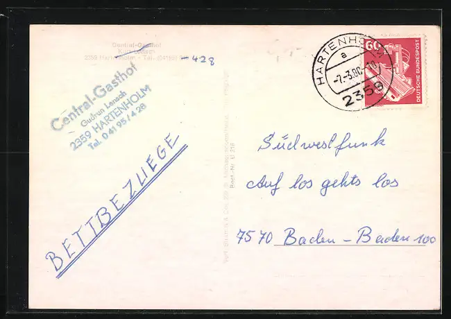 Personenbezogene Daten auf der Rückseite der Karte wurden durch blauen Textmarker unkenntlich gemacht. Die blauen Stellen sind auf die Vorderseite durchgeweicht und wirken sich negativ auf das Postkartenfoto aus