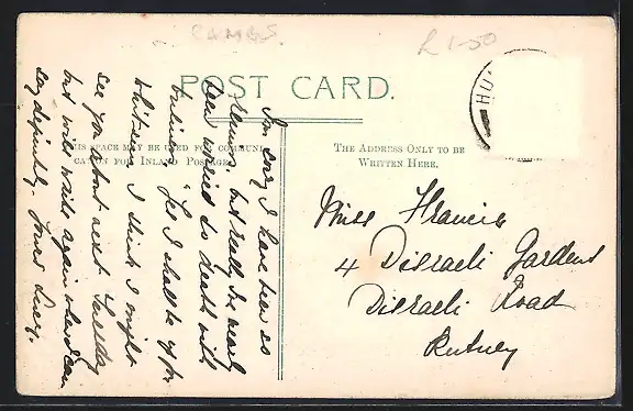 alte Ansichtskarte, gelaufen, Briefmarke entfernt, rückseitig Oberflächenschaden, Stempelspur, guter Zustand