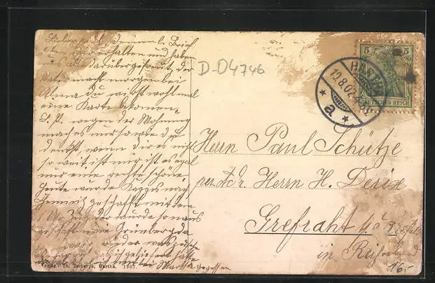 Personenbezogene Daten auf der Rückseite der Karte wurden durch blauen Textmarker unkenntlich gemacht. Die blauen Stellen sind auf die Vorderseite durchgeweicht und wirken sich negativ auf das Postkartenfoto aus
