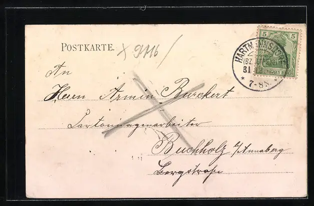 Personenbezogene Daten auf der Rückseite der Karte wurden durch blauen Textmarker unkenntlich gemacht. Die blauen Stellen sind auf die Vorderseite durchgeweicht und wirken sich negativ auf das Postkartenfoto aus