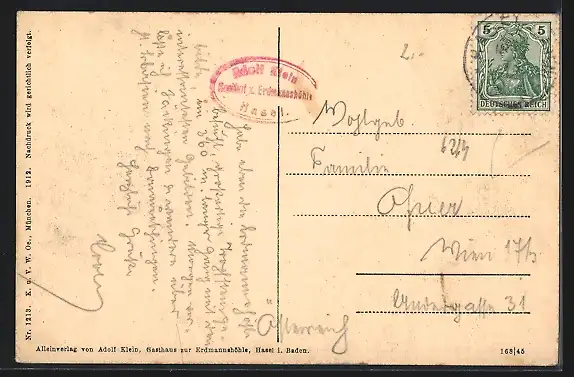 Personenbezogene Daten auf der Rückseite der Karte wurden durch blauen Textmarker unkenntlich gemacht. Die blauen Stellen sind auf die Vorderseite durchgeweicht und wirken sich negativ auf das Postkartenfoto aus