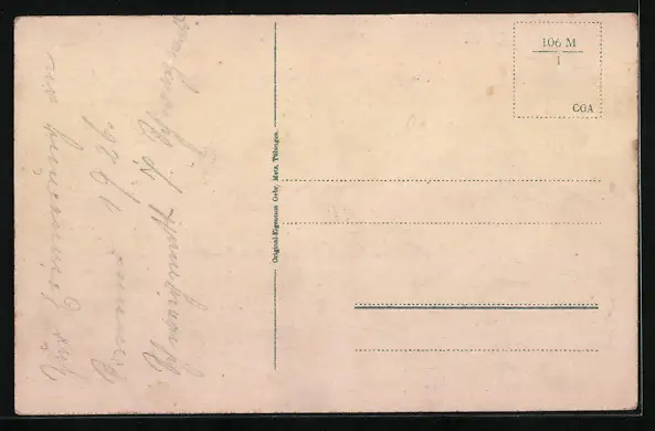 Personenbezogene Daten auf der Rückseite der Karte wurden durch blauen Textmarker unkenntlich gemacht. Die blauen Stellen sind auf die Vorderseite durchgeweicht und wirken sich negativ auf das Postkartenfoto aus