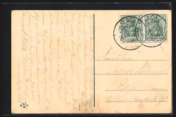 Personenbezogene Daten auf der Rückseite der Karte wurden durch blauen Textmarker unkenntlich gemacht. Die blauen Stellen sind auf die Vorderseite durchgeweicht und wirken sich negativ auf das Postkartenfoto aus