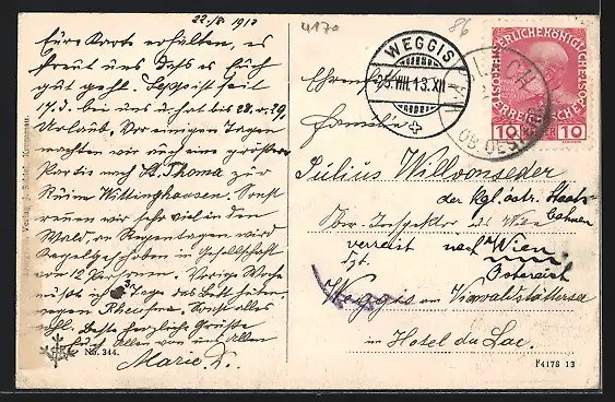 gelaufen 1913, rückseitig Klebe- und Papierreste, Eckknick li. oben, guter Zustand