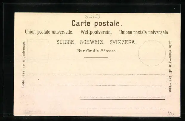 Personenbezogene Daten auf der Rückseite der Karte wurden durch blauen Textmarker unkenntlich gemacht. Die blauen Stellen sind auf die Vorderseite durchgeweicht und wirken sich negativ auf das Postkartenfoto aus