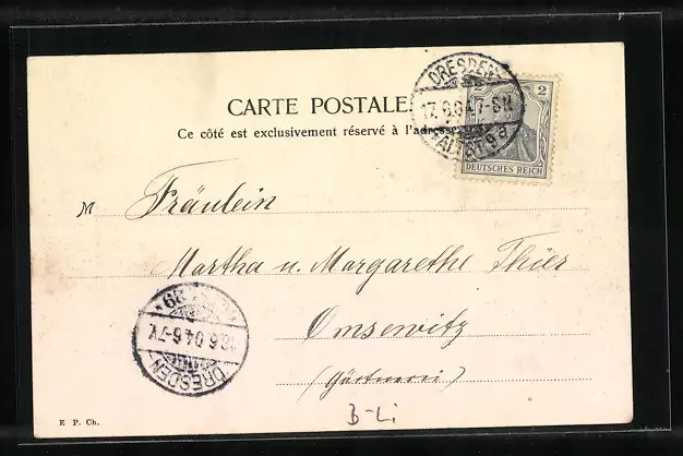 Personenbezogene Daten auf der Rückseite der Karte wurden durch blauen Textmarker unkenntlich gemacht. Die blauen Stellen sind auf die Vorderseite durchgeweicht und wirken sich negativ auf das Postkartenfoto aus