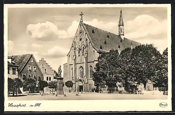 AK Hassfurt a. M., Ortspartie mit Kirche und Denkmal