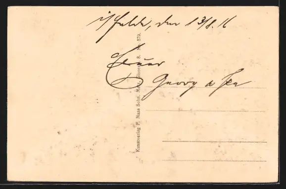 Personenbezogene Daten auf der Rückseite der Karte wurden durch blauen Textmarker unkenntlich gemacht. Die blauen Stellen sind auf die Vorderseite durchgeweicht und wirken sich negativ auf das Postkartenfoto aus