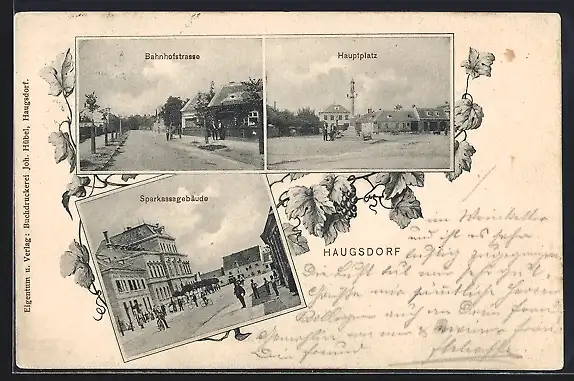 AK Haugsdorf, Bahnhofstrasse, Hauptplatz und Sparkassagebäude