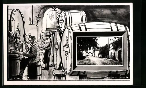 AK Haugsdorf, Strassenpartie mit Bäumen, Innenansicht Weinkeller, Passepartout