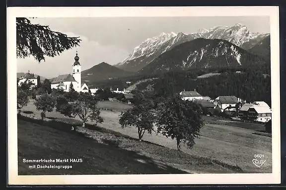 AK Haus, Teilansicht mit Kirche und Dachsteingruppe