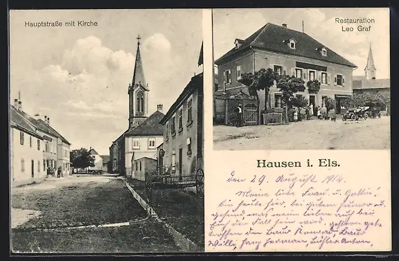 AK Hausen i. Els., Hauptstrasse mit Kirche, Restauration Leo Graf