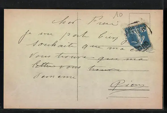 Personenbezogene Daten auf der Rückseite der Karte wurden durch blauen Textmarker unkenntlich gemacht. Die blauen Stellen sind auf die Vorderseite durchgeweicht und wirken sich negativ auf das Postkartenfoto aus