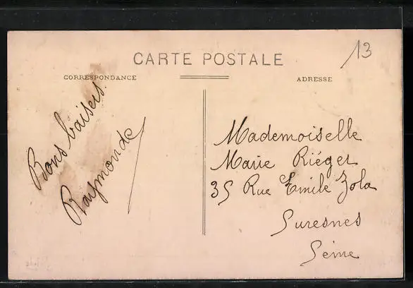 Personenbezogene Daten auf der Rückseite der Karte wurden durch blauen Textmarker unkenntlich gemacht. Die blauen Stellen sind auf die Vorderseite durchgeweicht und wirken sich negativ auf das Postkartenfoto aus