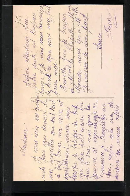 Personenbezogene Daten auf der Rückseite der Karte wurden durch blauen Textmarker unkenntlich gemacht. Die blauen Stellen sind auf die Vorderseite durchgeweicht und wirken sich negativ auf das Postkartenfoto aus