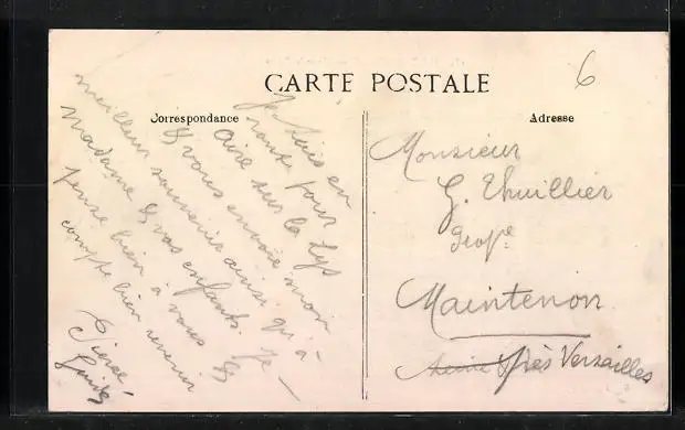 Personenbezogene Daten auf der Rückseite der Karte wurden durch blauen Textmarker unkenntlich gemacht. Die blauen Stellen sind auf die Vorderseite durchgeweicht und wirken sich negativ auf das Postkartenfoto aus