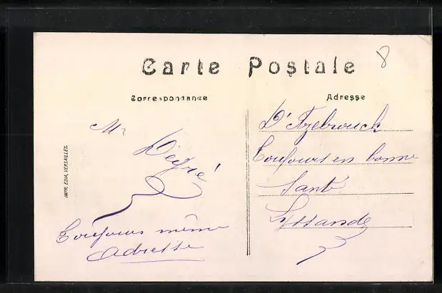 Personenbezogene Daten auf der Rückseite der Karte wurden durch blauen Textmarker unkenntlich gemacht. Die blauen Stellen sind auf die Vorderseite durchgeweicht und wirken sich negativ auf das Postkartenfoto aus