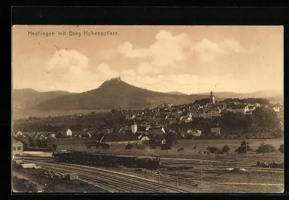 AK Hechingen, Ortsansicht mit Burg Hohenzollern und Bahnschienen