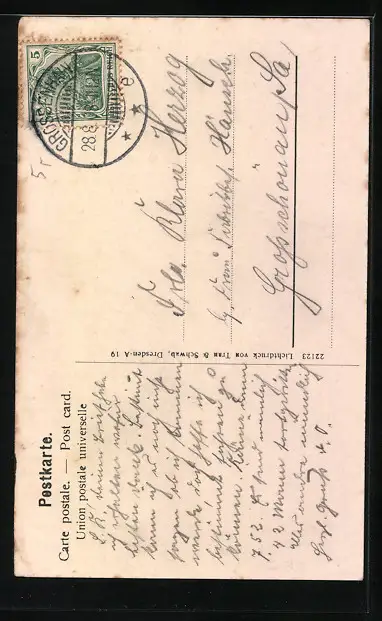 alte Ansichtskarte, gelaufen 1908, Eckknicke re., guter Zustand