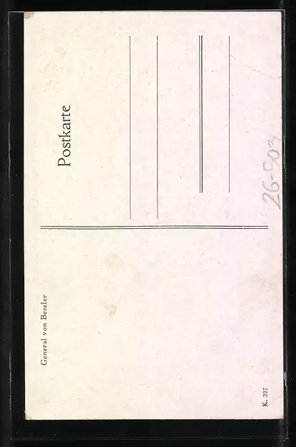 Personenbezogene Daten auf der Rückseite der Karte wurden durch blauen Textmarker unkenntlich gemacht. Die blauen Stellen sind auf die Vorderseite durchgeweicht und wirken sich negativ auf das Postkartenfoto aus
