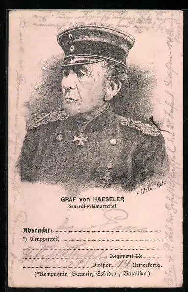 AK Heerführer Graf von Haeseler, Generalfeldmarschall, Portrait in dekorierter Uniform