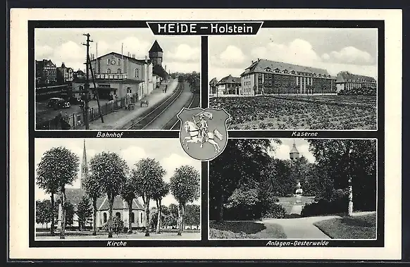 AK Heide / Holstein, Bahnhof, Kaserne, Kirche, Wappen
