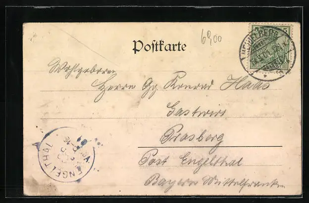 Personenbezogene Daten auf der Rückseite der Karte wurden durch blauen Textmarker unkenntlich gemacht. Die blauen Stellen sind auf die Vorderseite durchgeweicht und wirken sich negativ auf das Postkartenfoto aus