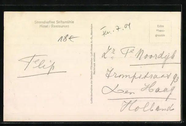Personenbezogene Daten auf der Rückseite der Karte wurden durch blauen Textmarker unkenntlich gemacht. Die blauen Stellen sind auf die Vorderseite durchgeweicht und wirken sich negativ auf das Postkartenfoto aus