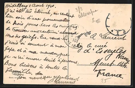 gelaufen 1910, Briefmarke entfernt, Stempelspur, guter Zustand
