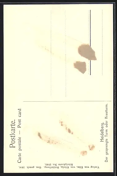 Personenbezogene Daten auf der Rückseite der Karte wurden durch blauen Textmarker unkenntlich gemacht. Die blauen Stellen sind auf die Vorderseite durchgeweicht und wirken sich negativ auf das Postkartenfoto aus