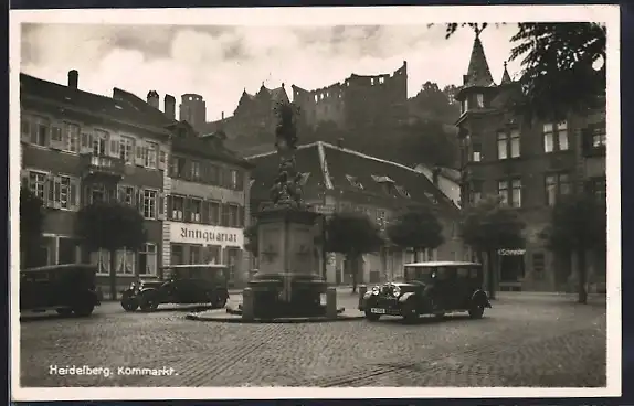 AK Heidelberg, Kornmarkt mit Geschäften und Denkmal