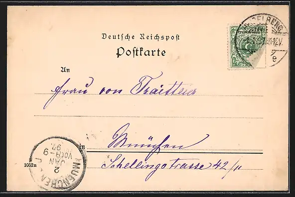 alte Ansichtskarte, gelaufen 1897, Briefmarke entfernt, guter Zustand