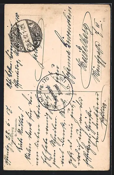 Personenbezogene Daten auf der Rückseite der Karte wurden durch blauen Textmarker unkenntlich gemacht. Die blauen Stellen sind auf die Vorderseite durchgeweicht und wirken sich negativ auf das Postkartenfoto aus