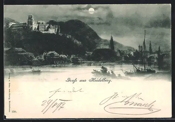 AK Heidelberg, Uferpartie mit Burg bei Mondschein