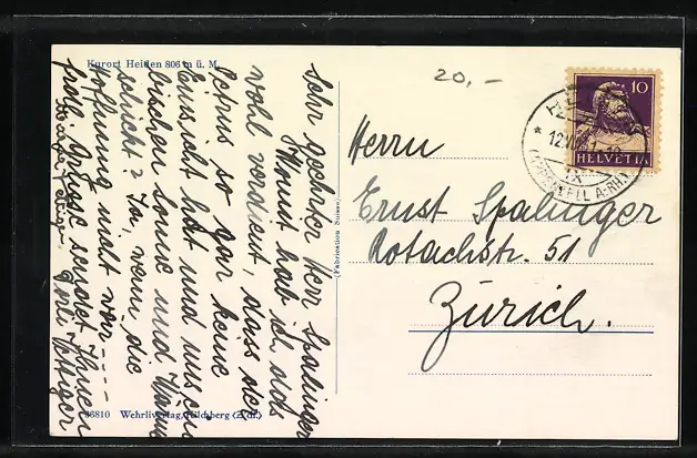 Personenbezogene Daten auf der Rückseite der Karte wurden durch blauen Textmarker unkenntlich gemacht. Die blauen Stellen sind auf die Vorderseite durchgeweicht und wirken sich negativ auf das Postkartenfoto aus
