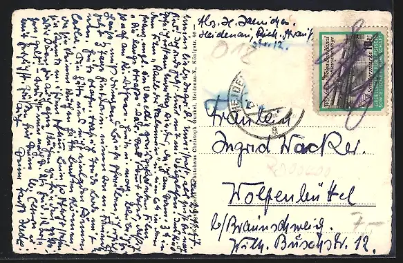 Personenbezogene Daten auf der Rückseite der Karte wurden durch blauen Textmarker unkenntlich gemacht. Die blauen Stellen sind auf die Vorderseite durchgeweicht und wirken sich negativ auf das Postkartenfoto aus