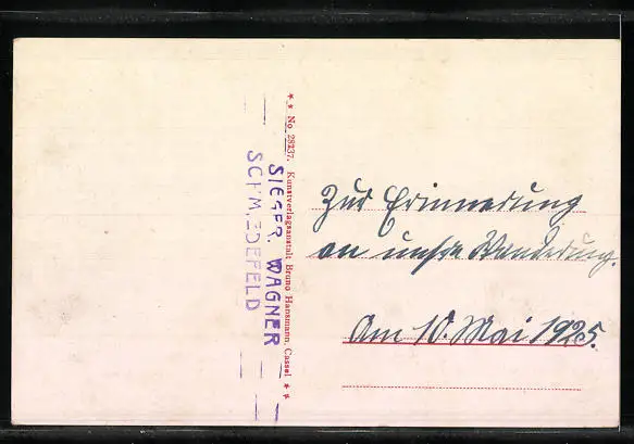 Personenbezogene Daten auf der Rückseite der Karte wurden durch blauen Textmarker unkenntlich gemacht. Die blauen Stellen sind auf die Vorderseite durchgeweicht und wirken sich negativ auf das Postkartenfoto aus