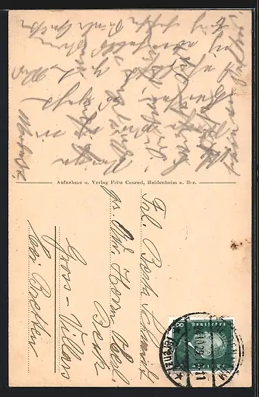 Personenbezogene Daten auf der Rückseite der Karte wurden durch blauen Textmarker unkenntlich gemacht. Die blauen Stellen sind auf die Vorderseite durchgeweicht und wirken sich negativ auf das Postkartenfoto aus