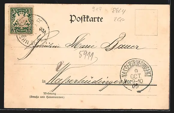 Personenbezogene Daten auf der Rückseite der Karte wurden durch blauen Textmarker unkenntlich gemacht. Die blauen Stellen sind auf die Vorderseite durchgeweicht und wirken sich negativ auf das Postkartenfoto aus