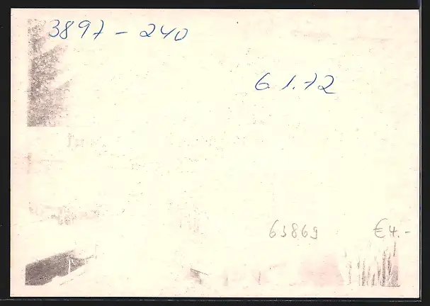 Personenbezogene Daten auf der Rückseite der Karte wurden durch blauen Textmarker unkenntlich gemacht. Die blauen Stellen sind auf die Vorderseite durchgeweicht und wirken sich negativ auf das Postkartenfoto aus