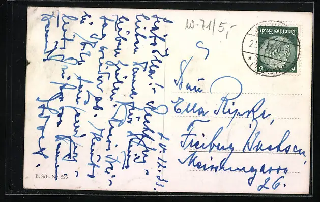 Personenbezogene Daten auf der Rückseite der Karte wurden durch blauen Textmarker unkenntlich gemacht. Die blauen Stellen sind auf die Vorderseite durchgeweicht und wirken sich negativ auf das Postkartenfoto aus