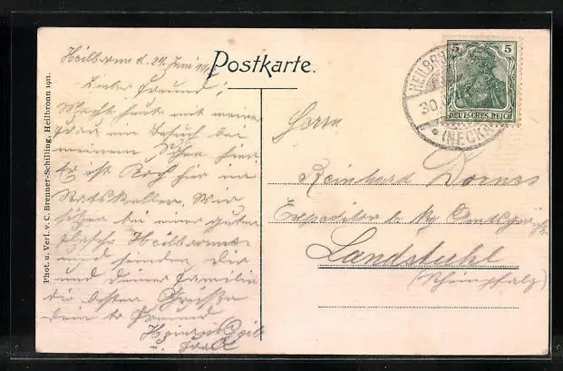 Personenbezogene Daten auf der Rückseite der Karte wurden durch blauen Textmarker unkenntlich gemacht. Die blauen Stellen sind auf die Vorderseite durchgeweicht und wirken sich negativ auf das Postkartenfoto aus