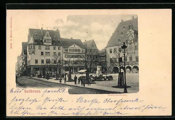 AK Heilbronn, Strassenpartie mit Geschäft und Denkmal