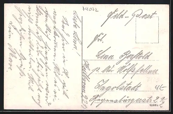 Personenbezogene Daten auf der Rückseite der Karte wurden durch blauen Textmarker unkenntlich gemacht. Die blauen Stellen sind auf die Vorderseite durchgeweicht und wirken sich negativ auf das Postkartenfoto aus