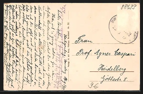 Personenbezogene Daten auf der Rückseite der Karte wurden durch blauen Textmarker unkenntlich gemacht. Die blauen Stellen sind auf die Vorderseite durchgeweicht und wirken sich negativ auf das Postkartenfoto aus
