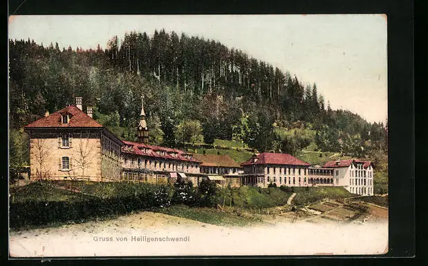 AK Heiligenschwendi, Gebäudepartie am Waldrand