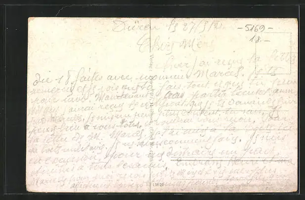 Personenbezogene Daten auf der Rückseite der Karte wurden durch blauen Textmarker unkenntlich gemacht. Die blauen Stellen sind auf die Vorderseite durchgeweicht und wirken sich negativ auf das Postkartenfoto aus